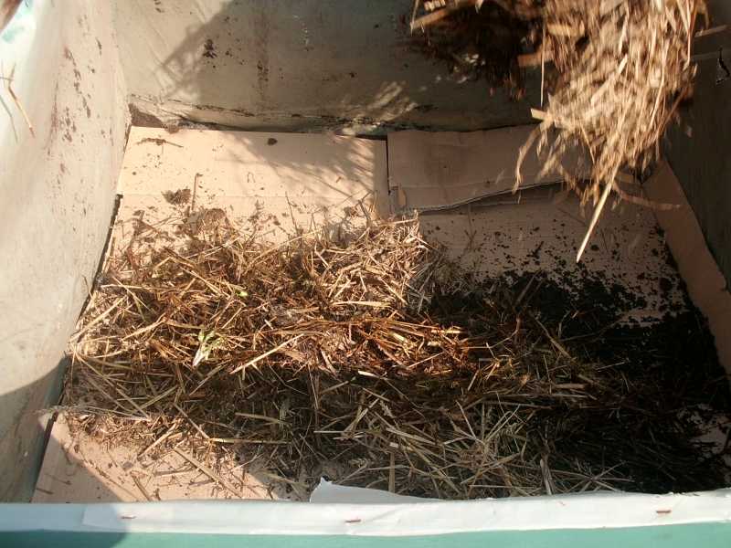 étape 4 : une couche de "déchets bruns" (ici des feuilles mortes récupérées cet automne), qu'on trempe dans de l'eau avant de le mettre dans le bac